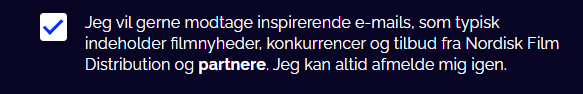 Hvis du allerede har en bruger på Nordisk Film+, kan du tilmelde dig nyhedsbrevet under Min konto ved at sætte et i boksen nederst på siden.